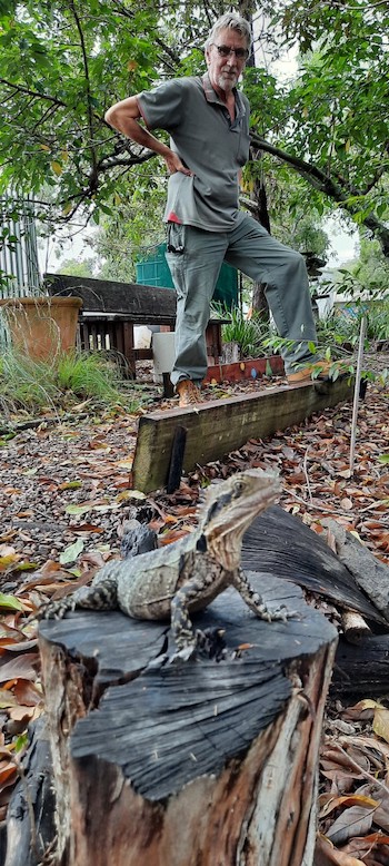 Small lizards also play on the forest floor. One, an Eastern water dragon has been a resident for a while and appears to wait patiently for Sean (especially as he offers her meat titbits from home). She has been named Lizzie and has really come to be a part of the scenery during the warmer months. She disappears during the colder periods and once was not seen for over six months after heavy rains had (we presume) taken her downstream towards Bulimba Creek. But she made her way back.